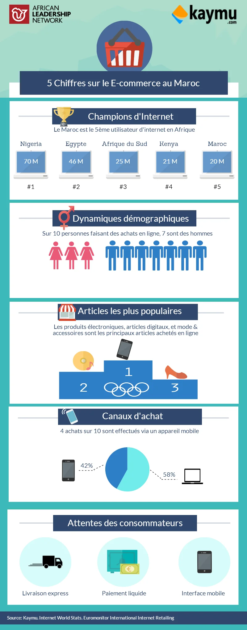 Kaymu.ma, la marketplace fondée par Africa Internet Holding, vient de partager ses données sur le e-commerce en Afrique. Celles-ci offrent des données intéressantes sur le e-commerce au Maroc, sur le nombre d’internautes ainsi que les habitudes de consommation de ceux-ci. Les autres pays participants sont le Kenya, le Nigéria, l’Egypte et l’Afrique du Sud, dont vous retrouverez les infographies ci-dessous :