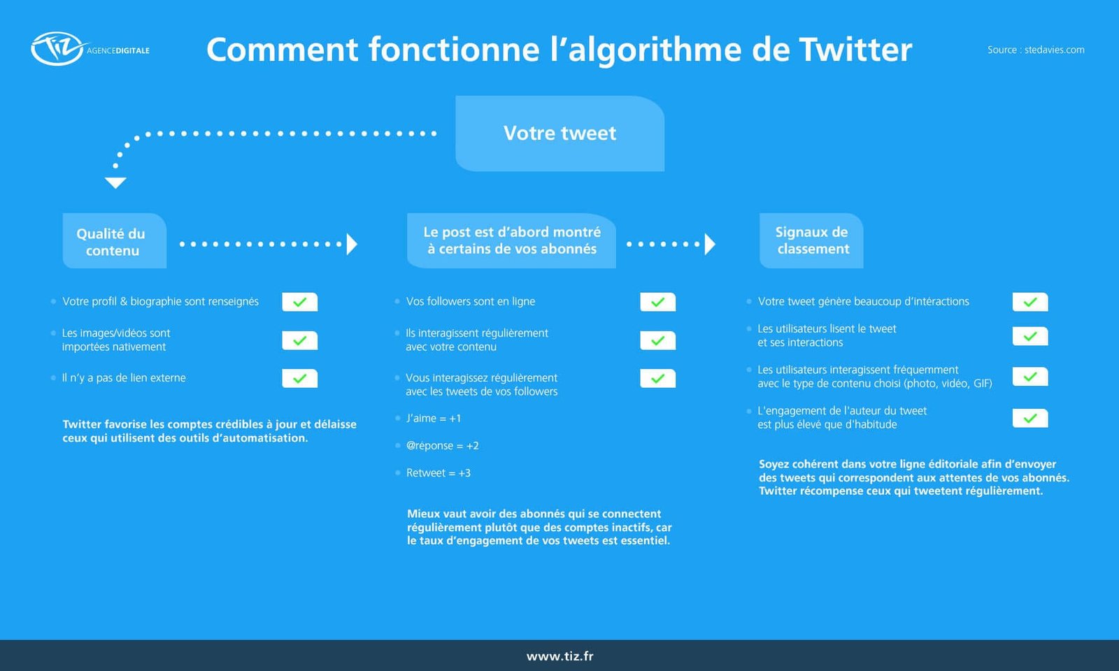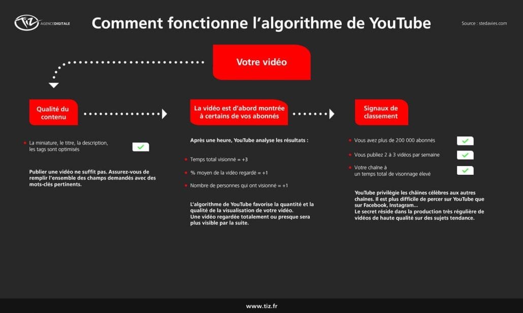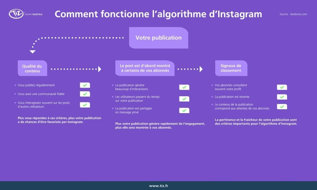 Pourtant une étude de Stephen Davies relève le pari d’expliquer la mécanique et les principaux facteurs qui composent les algorithmes de Facebook, Instagram, Twitter, LinkedIn et YouTube. Une étude que les équipes de l’agence digitale Tiz ont illustré et adapté pour le marché francophone.