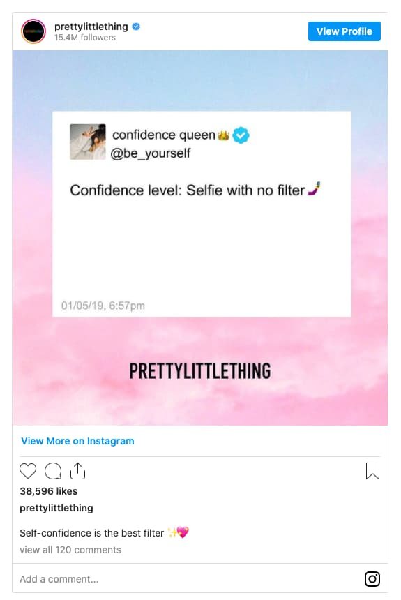 Traditionnellement, sur Instagram, la culture du même est l’apanage des créateurs de contenus indépendants, tels que @daquan ou @thefatjewish. Pourtant, depuis quelques mois, des marques principalement de mode, de @boohoo à @prettylittlethings, @missguided ou @hellosunshine, se sont saisies de la tendance et republient non pas leurs propres tweets sur Instagram mais partagent désormais des captures d’écran de tweets viraux issus de leur communauté qui reflètent leur style, leur attitude et leurs messages… succès assuré auprès de leurs abonnés.
