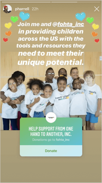 Les influenceurs et les célébrités exploitent déjà cette nouvelle fonctionnalité : le musicien Pharrell Williams a ainsi partagé le sticker de don pour soutenir From One Hand to Another, qui aide les enfants défavorisés à réaliser leur potentiel.